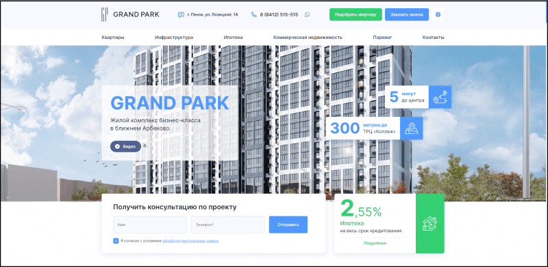 - Слоган и стиль веб-страницы. Должны способствовать идентификации ЖК на основании индивидуальной характеристики. К примеру, для комплекса эконом-класса мы больше делаем акцент на комфорте и семейных ценностях, а на сайте бизнес и элитного жилого квартала используем имиджевые слоганы и полноэкранные визуалы.