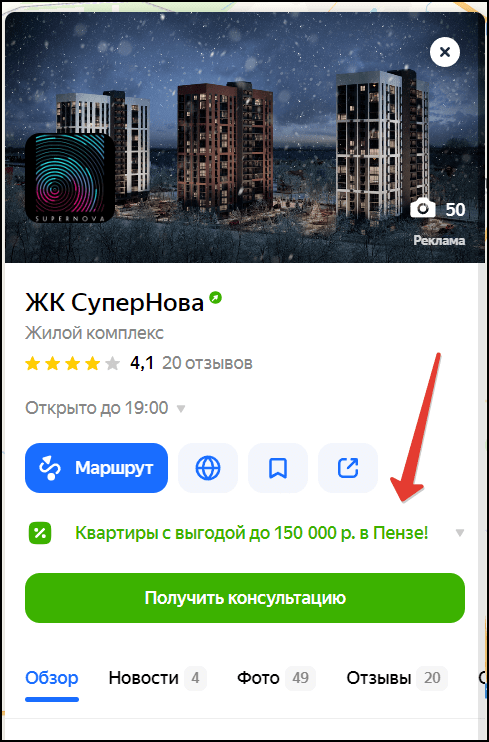 - Размещение карточки жилого комплекса в блоке «похожие организации» на карточках конкурентов, у которых не подключено приоритетное размещение.