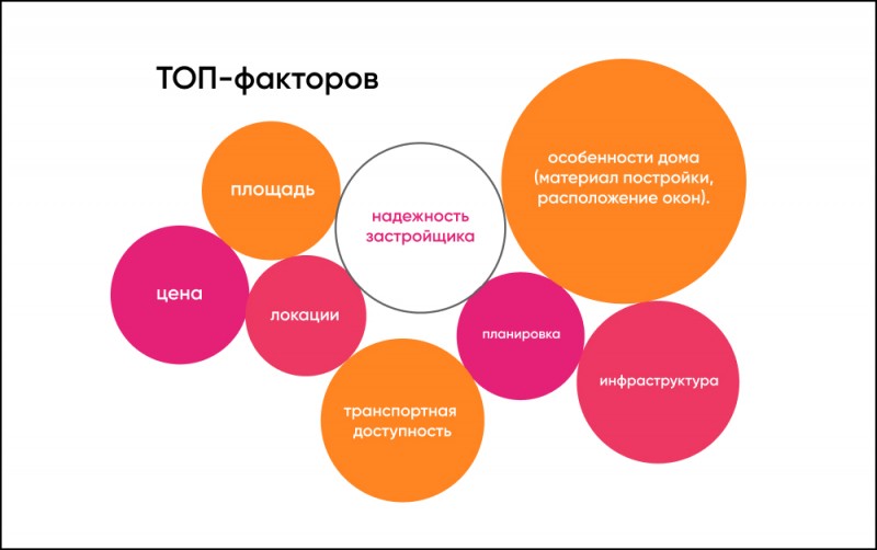 Факторы, влияющие на принятие решения, оказывают разное влияние на ЦА. Например, для Комфорт-класса на первом месте находится цена и транспортная доступность, а для Бизнес-класса – локация и вид из окна будущей квартиры.