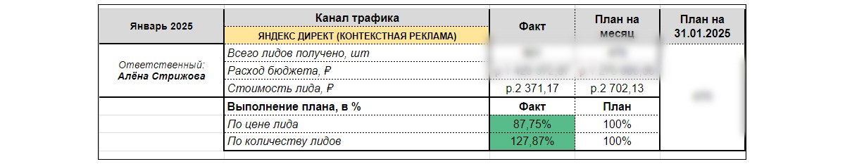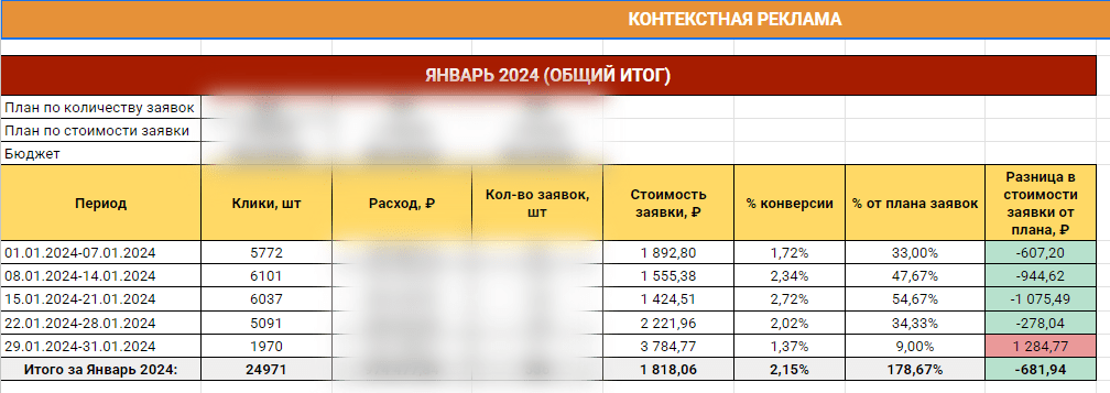 Уже в Январе 2024 года нам наконец-то удалось выйти на те показатели, на которые мы рассчитывали. На скриншоте ниже можно увидеть, что наконец-то удалось стабилизировать стоимость заявки и увеличить % конверсии. План по количеству лидов наконец-то был перевыполнен!