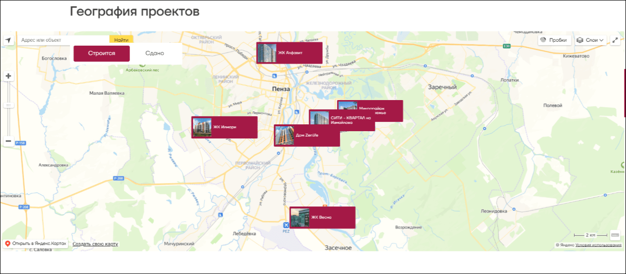 - Специальная карта с фильтром «Строится / Сдано».