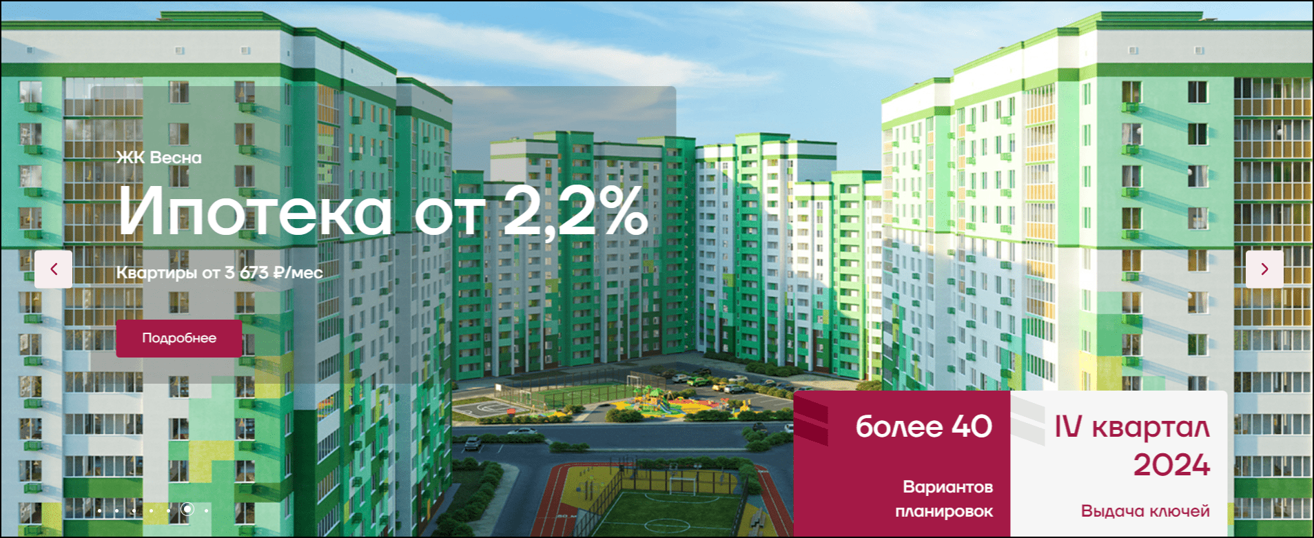 Мы решили разработать слайдер из рендеров жилых комплексов с указанием уникального торгового предложения, количества планировок и стадией строительства объекта.