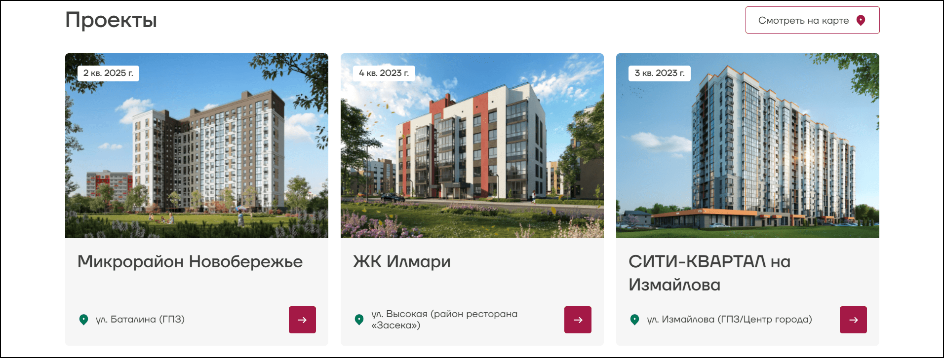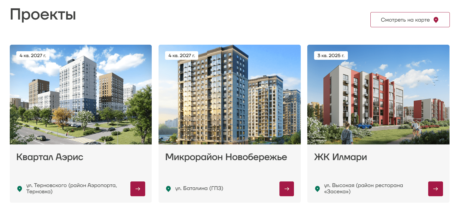 Жилые комплексы застройщика можно более подробно изучить, перейдя по ссылке «Проекты», где содержаться: