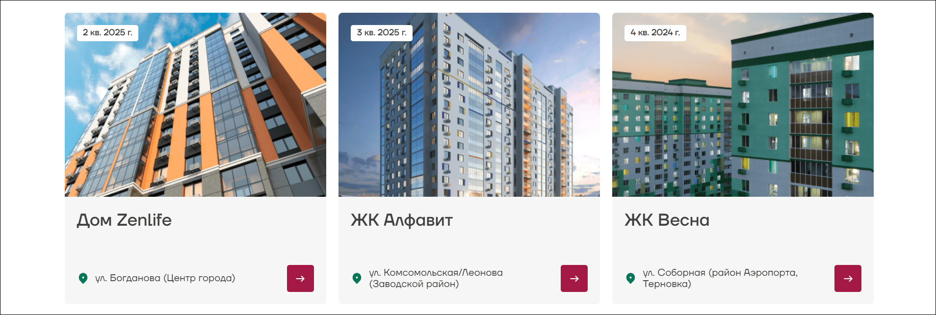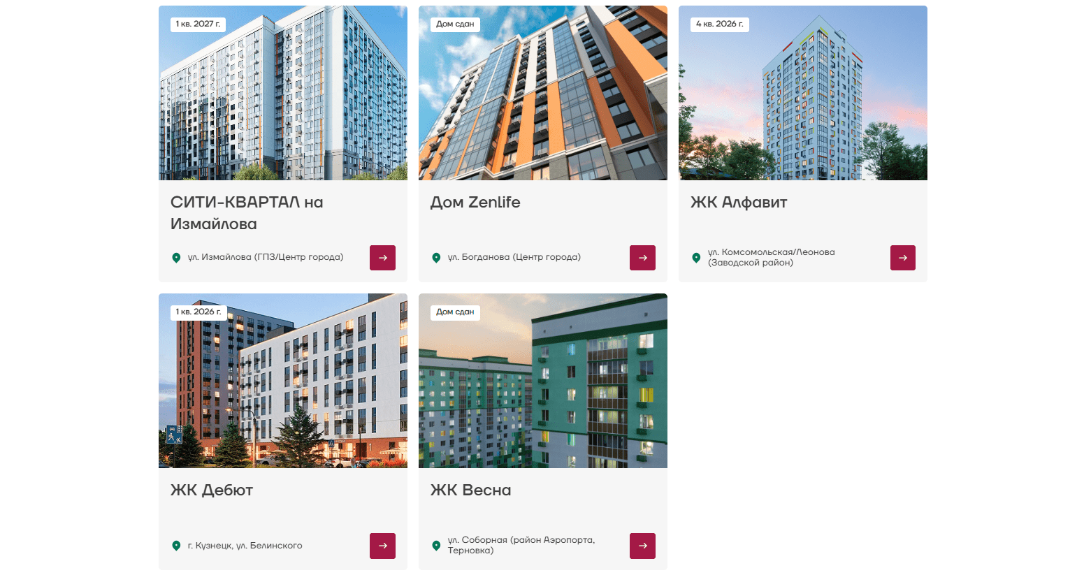 Ниже расположен перечень всех ЖК, их месторасположение и квартал, когда покупатель сможет забрать ключи от новой квартиры. Более детально ознакомится с жилым комплексом можно, кликнув по стрелке.