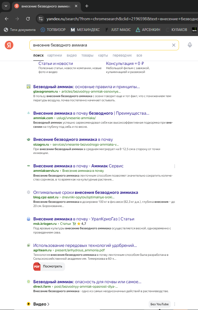 Первым этапом стало исследование верхних позиций выдачи по самому широкому запросу «внесение безводного аммиака». Анализ показал, что около 60% ТОПа занимают аналогичные сайты, а также информационные сайты со статьями по технологии внесения безводного аммиака.