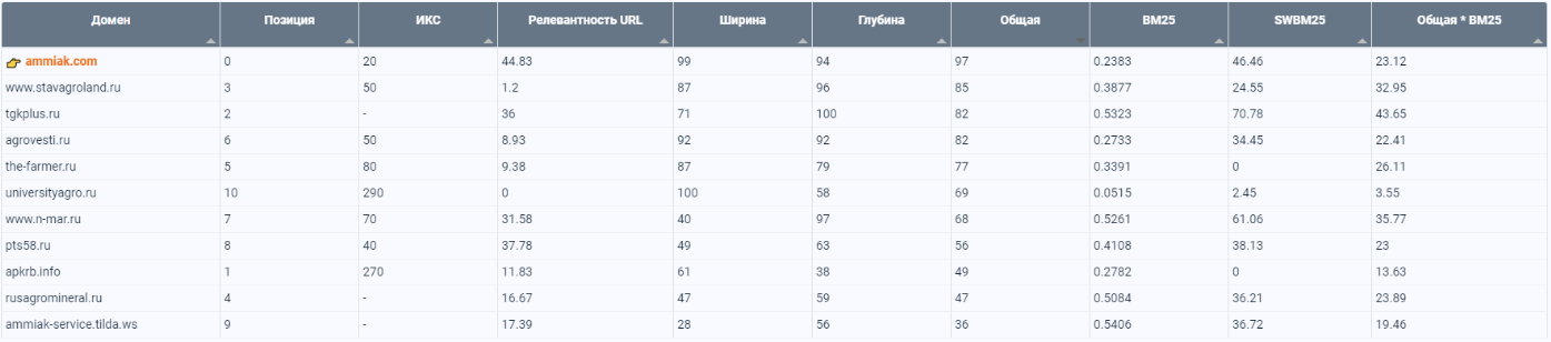 В качестве примера приведем текущие показатели релевантности страницы Внесение аммиака.