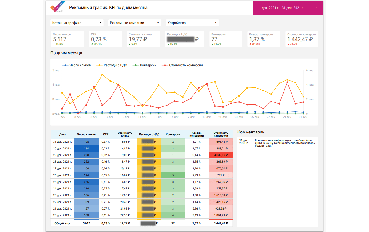 Также чтобы собрать и визуализировать все данные по рекламе в одном месте, автоматизировать систему отчетности по проекту мы разработали отчет в Google Data Studio. Пример нескольких страниц из отчета на скриншотах ниже: