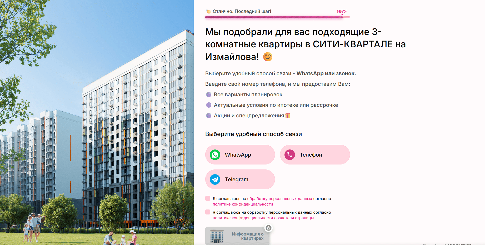 Чтобы выбор квартиры был максимально удобным и простым на сайте представлены различные способы связи с отделом продаж и каждый имеет возможность получить подробную консультацию по любому вопросу. в арсенале есть следующий набор: оставить заявку в форме на сайте, заказать обратный звонок, позвонить или перевести общение в социальные сети или мессенджеры.