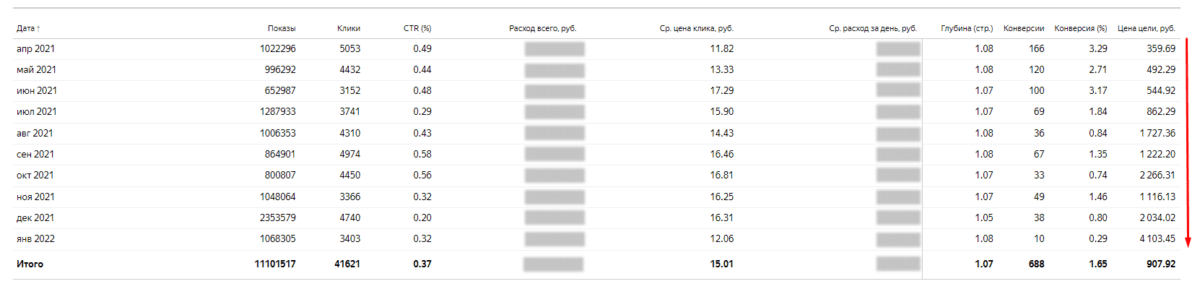 С каждым месяцем стоимость конверсии росла при прочих равных условиях. На скриншоте представлена статистика за 10 месяцев работы по проекту.
