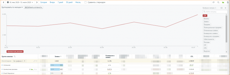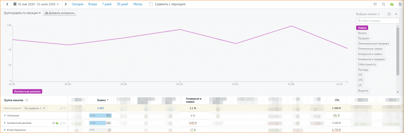 Рисунок 3 – Динамика изменения количества обращений с контекстной рекламы за 01.01.2020 – 31.07.2020. Скриншот из системы сквозной аналитики Roistat