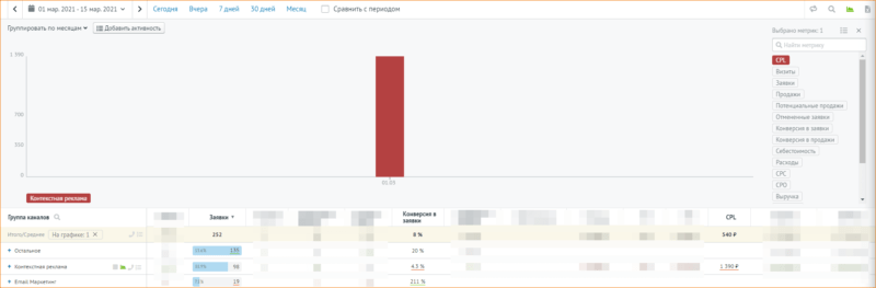 Мы не планируем останавливаться на достигнутом и в этом проекте продолжаем проводить оптимизацию рекламные кампаний и тестировать новые гипотезы для улучшения показателей. Например, в марте 2021 мы решили сделать перераспределение бюджета в сторону поисковой рекламы и узнать, как это скажется на количестве обращений, их стоимости и какой будет итоговый % квалификации.