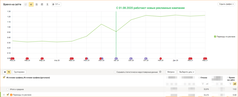 - Время на сайте. Показатель начал расти с сентября 2020 года и теперь стабильно находится в районе 1 минуты 20 секунд.