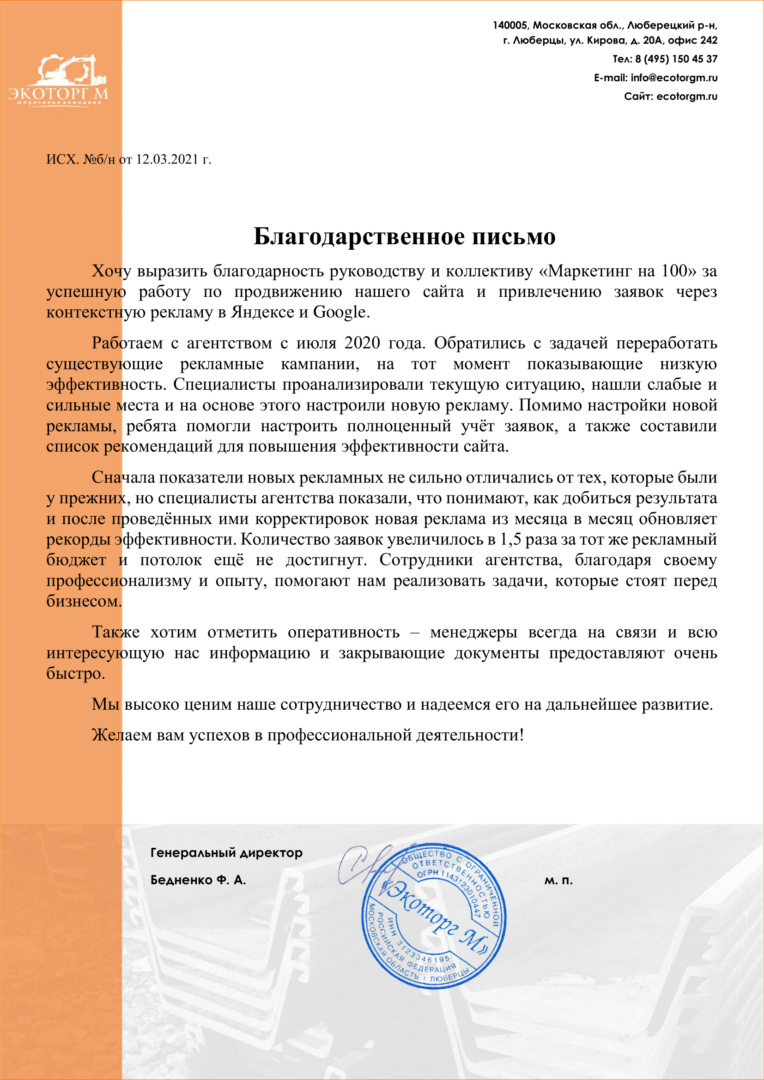 Специалисты проанализировали текущую ситуацию, нашли слабые и сильные места и на основе этого настроили новую рекламу. Помимо настройки новой рекламы, ребята помогли настроить полноценный учёт заявок, а также составили список рекомендаций для повышения эффективности сайта. Также хотим отметить оперативность менеджеры всегда на связи и всю интересующую нас информацию и закрывающие документы предоставляют очень быстро.