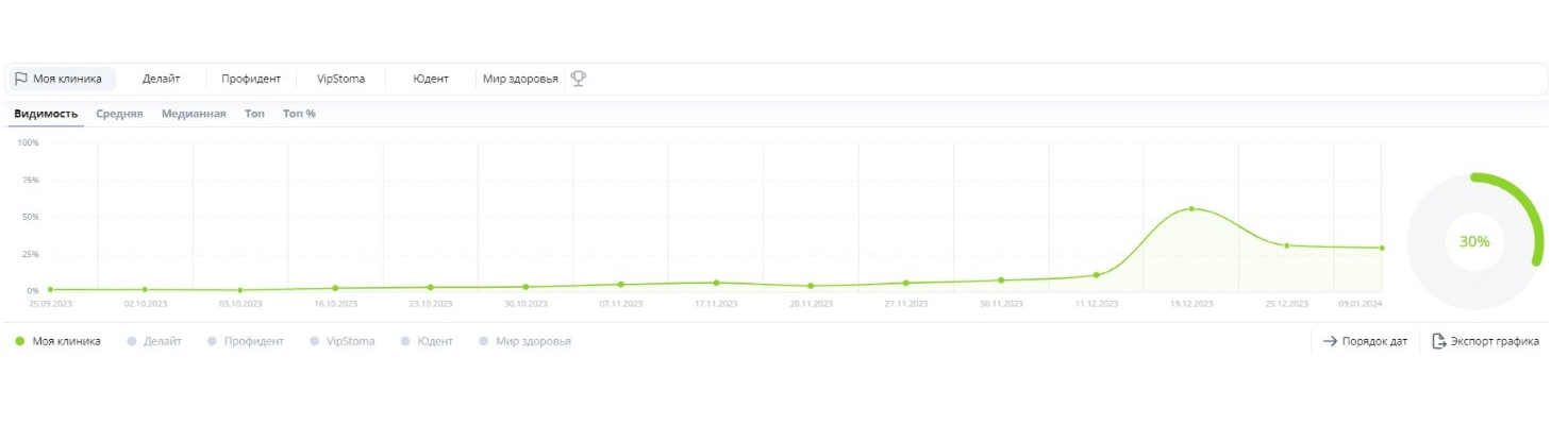 Всего за полгода из сайта с околонулевой видимостью мы превратили сайт «Мою клинику» в одного из лидеров видимости, что приносит владельцам стоматологии хороший объем трафика, а следовательно — прибыль, которая многократно перекрывает затраты на SEO-сопровождение.