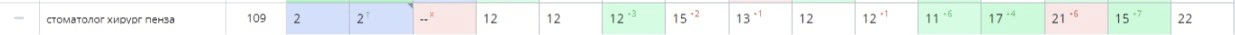 Остальные 40% выдачи приходятся на сайты частных стоматологий. Исходя из этого было решено продвигаться не по самому очевидному пути (через высокочастотные запросы по типу «запись к стоматологу пенза», «стоматология пенза» и. т.д.) а через среднечастотные запросы, т. е. конкретные услуги, например через «удаление зуба пенза», «имплантация зубов пенза» и. т.д. В этом сегменте запросов конкуренция значительно ниже, поэтому есть шанс занять хорошие позиции в относительно сжатые сроки.