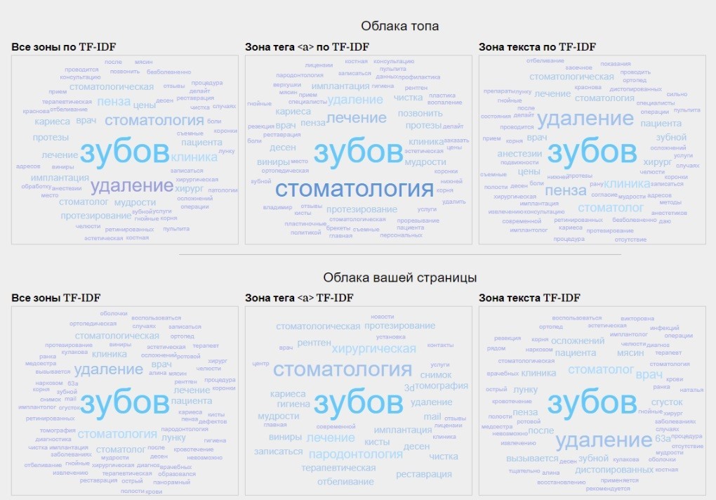 Покажем для примера результаты проработки страницы под запрос «удаление зуба Пенза». По общей текстовой релевантности страница находится в лидерах среди ближайших конкурентов. Следовательно, для поисковых систем она является одной из самых привлекательных, и они будут показывать ее выше, чем аналогичные страницы конкурентов с меньшими показателями релевантности.