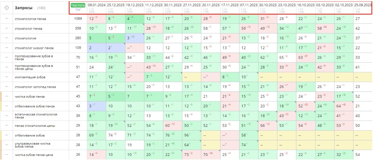 Вот наши позиции по каждому из запросов. Уделите внимание сектору, выделенному красной рамкой. Из него мы видим, что количество запросов в ТОП-10 с 25.09.2023 года по 09.01.2024 выросло с 9 процентов до 50! Никаких накруток, только «белое» SEO.