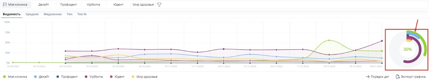 Для сравнения, вот данные по видимости сайта относительно конкурентов. Как видите, на данном этапе мы находимся на 2-ом месте по общей видимости с большим отрывом от ближайших конкурентов, и это при том, что мы занимаемся сайтом «Моя клиника» всего полгода, а наши конкуренты — хорошо проработанные с точки зрения SEO сайты с долгой историей.