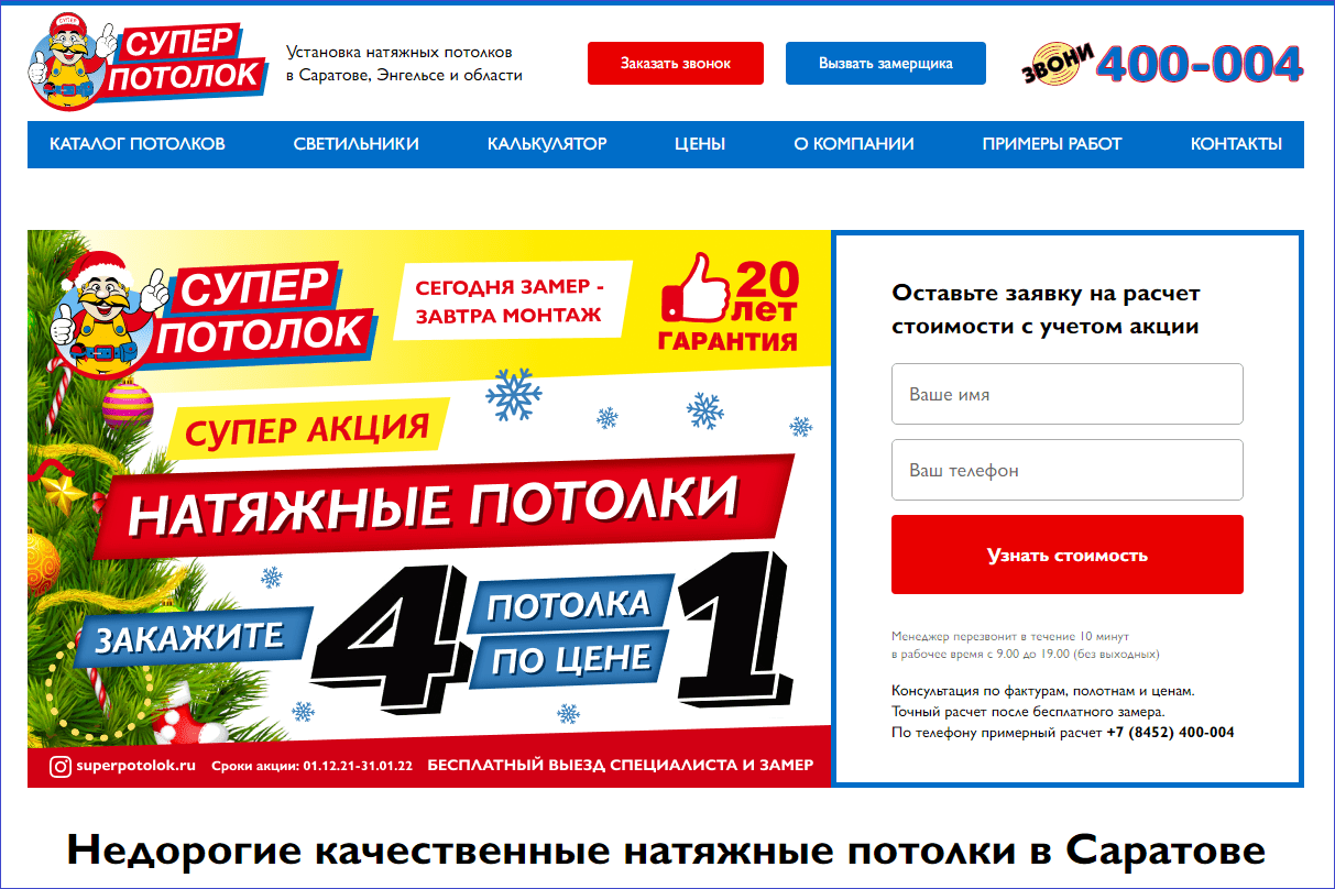 Клиент обратился к нам в ноябре 2019 года. На тот момент ООО «Супер Потолок» работал только в Саратове и у него уже был разработан сайт для работы в данном городе. При этом, кроме пассивного органического продвижения сайта в поисковиках Яндекс и Google, у компании не было дополнительных каналов в интернете для привлечения клиентов – ни контекстная, ни таргетированная реклама не использовались.