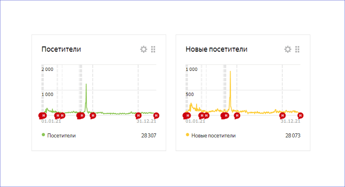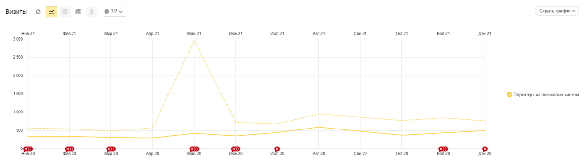 Количество переходов с SEO в 2021 году увеличилось вдвое по сравнению с 2020 годом. Это видно на скриншоте из Яндекс.Метрики, который приведён ниже. График по 2021 году изображён пунктирной линией.