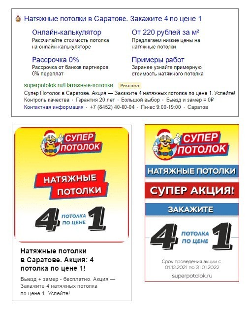 В Google Реклама мы приняли решение использовать только поисковую рекламу, так как по нашему опыту реклама в КМС не даёт эффективных результатов в нише натяжных потолков.
