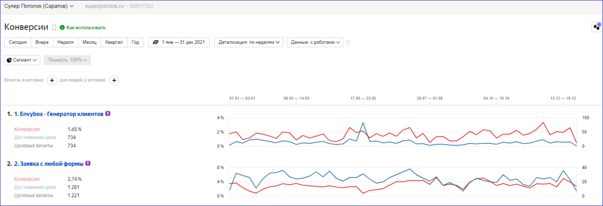 В течение 2021 года интернет-маркетинг стабильно приносил клиенту 200-250 обращений в месяц по цене 650 ₽ за одно обращение. Примерно 85% обращений переходят в замер.