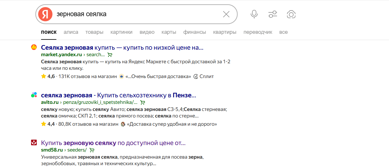 Первым этапом стал анализ выдачи по самому широкому запросу «купить зерновую сеялку». Он показал, что в ТОП-30 находятся всего 2-3 производителя сеялок (с лендингами вместо многостраничных сайтов), а все остальное – дилеры сельхозпродукции.