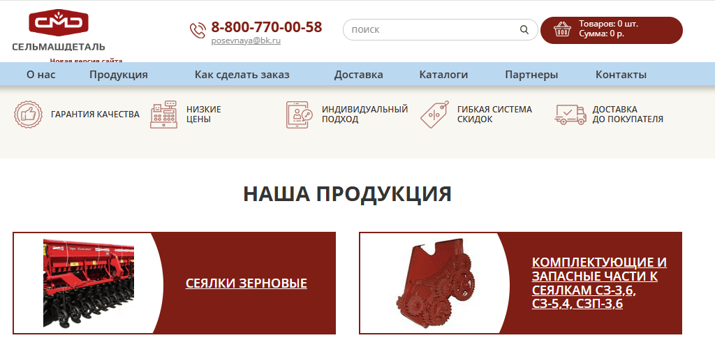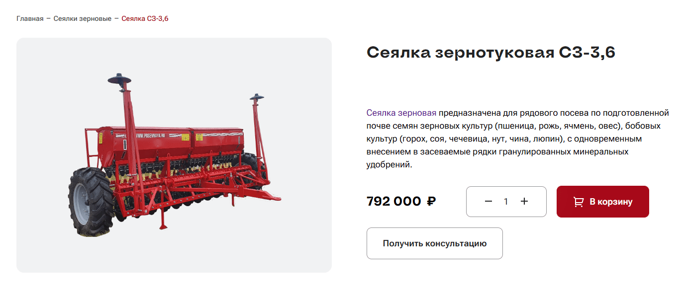 Указанный нюанс сильно осложнял SEO-продвижение уже на старте, так как по широте ассортимента наша компания сильно проигрывает. У «СельМашДеталь» представлены только сеялки и комплектующие, в то время как у конкурентов — сеялки, культиваторы, бороны, плуги, трактора и так далее. В общем, было сложно.